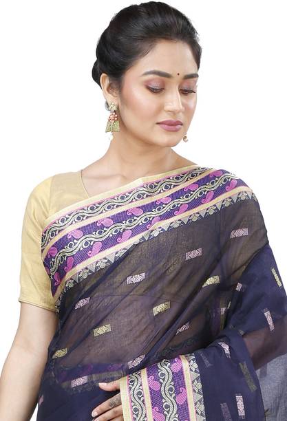 3.Tant (West Bengal): A staple in Bengali households, Tant sarees are known for their crisp texture, lightness, and breathability, making them perfect for hot and humid climates. They feature vibrant colors and intricate designs on the pallu and border, inspired by nature and mythology.