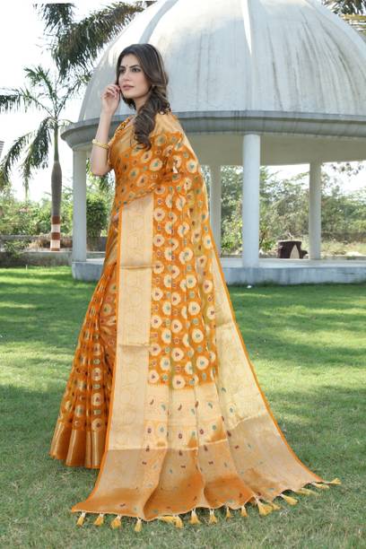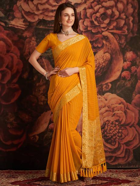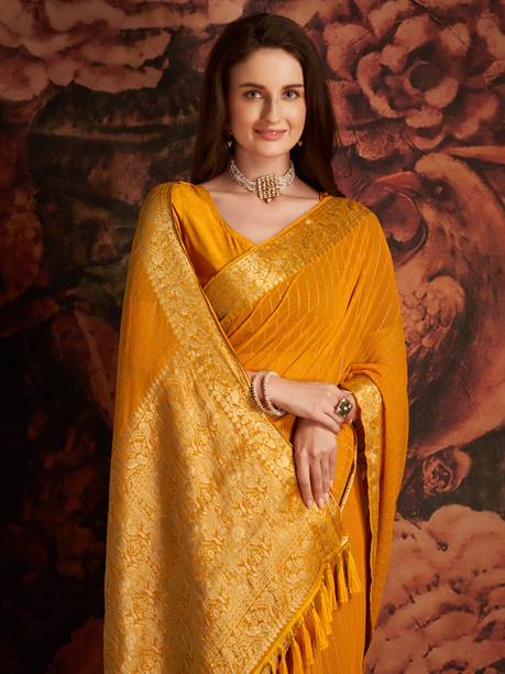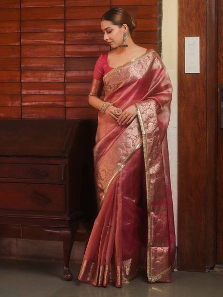 Lightweight organza is ruling the season with its airy, translucent texture. Expect delicate embroidery, digital prints, or 3D floral appliqués. Chiffon and tissue sarees with a soft, graceful drape are equally in demand.